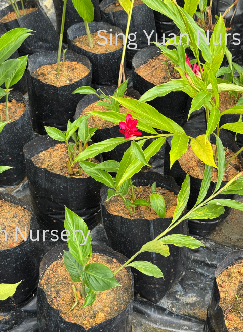 A vibrant tropical plant with upright stems, glossy green leaves, and striking bright red flower bracts that create a bold vertical accent. Forms lush clumps with continuous blooms in warm climates.