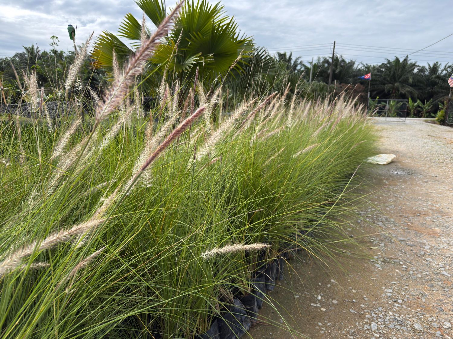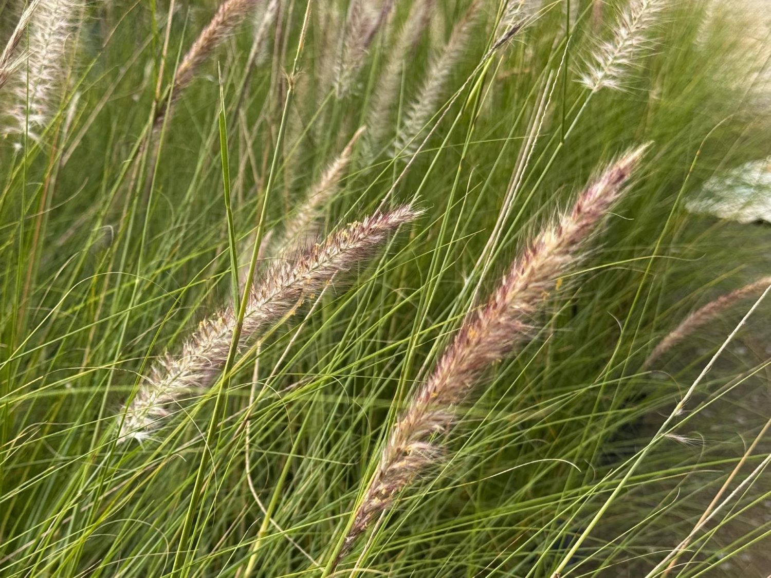 A compact ornamental grass with fine arching foliage and deep burgundy-to-black flower spikes that add dramatic contrast.